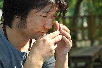 Le second (et dernier) thé sera un Oolong torréfié. J'en proposai 3: le Dong Ding de compétition de ce printemps, le Hung Shui Oolong de Shan Lin Shi du printemps 2011 et le GueiFei Oolong d'Alishan de ce printemps. Après délibérations, l'organisatrice Taiwanaise a convaincu les autres que cet Oolong Guei Fei est très rare, car il dépend aussi de la morsure d'un petit criquet vert, et qu'il fallait absolument y goûter!